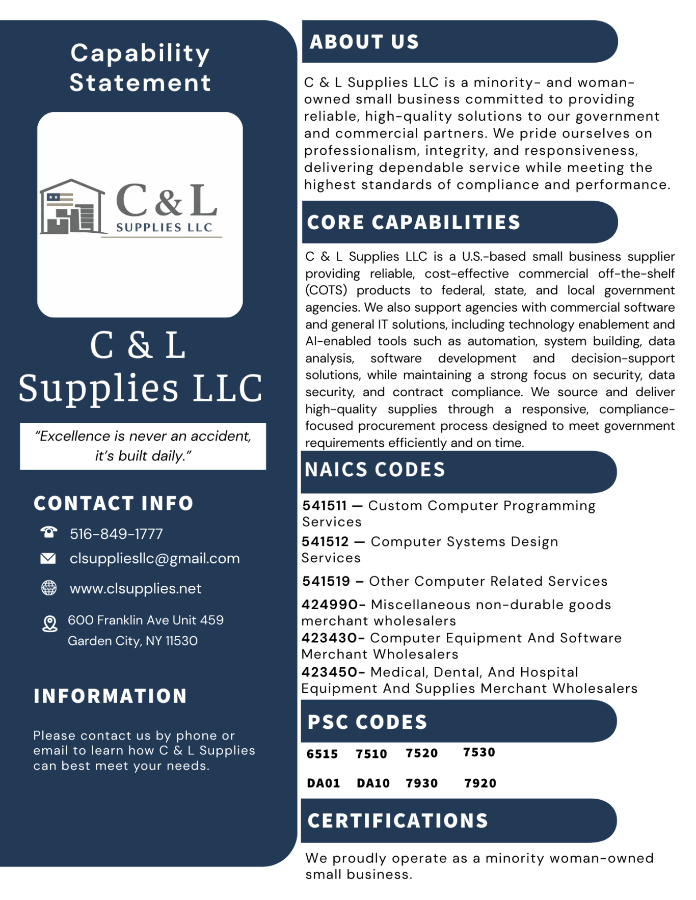 C & L Supplies LLC provides sourcing, procurement, and distribution of commercial off-the-shelf (COTS) products to federal, state, and local government agencies. We support micro-purchases and simplified acquisitions with compliant, responsive, and reliable fulfillment, and can also assist with technology initiatives involving AI-enabled tools, computer software solutions, and workflow automation. Please click the link below to see the full list of capabilities.